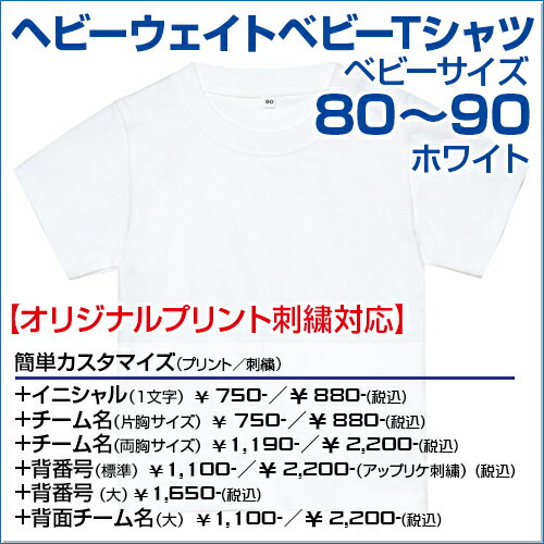 商品名 ■ヘビーウェイトベビーTシャツ【ホワイト】 商品説明 スナップボタンで着脱しやすいベビーのための定番Tシャツ ※オリジナルプリント・刺繍対応商品 イニシャル¥680-(刺繍¥800-) チーム名(片胸サイズ) ¥680-(刺繍¥800-) チーム名(両胸サイズ) ¥1,080-(刺繍¥1280-) 背番号(標準) ¥1,000-(アップリケ刺繍¥2000-) 背番号(大) ¥1,500- 背面チーム名(大) ¥1,000-(刺繍¥1200-) ※内容によりプリント方法が異なります ※フルカラープリントご希望の方は別途お問い合わせください (プリントの大きさによりプリント代が変わります) 関連商品 ヘビーウェイトベビーTシャツ【カラー】 サイズ 80・90 カラー ホワイト スナップテープ ブラック・ネイビー:ブラックテープ その他のカラー:ホワイトテープ 素材 190g/m2(5.6oz) 17/-天竺 綿100% ※ホワイトのみ綿糸縫製 ※杢グレー:綿80%/ポリエステル20% 発送方法 1点まで発送可能