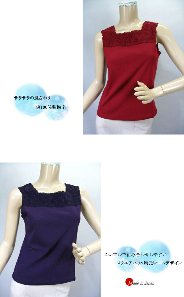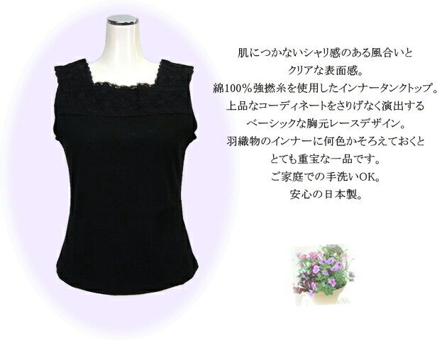 タンクトップ 綿100% 強撚糸 胸元レース インナー 日本製 ミセス シニア 50代 60代 70代 母